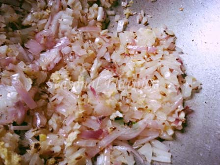 • Heat oil in a pan and sizzle cumin seeds. Tip in finely chopped ginger, garlic, onion and green chilli. Saute till the onion becomes brown.