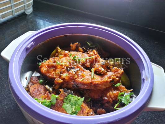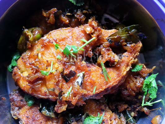- Heat oil in a deep-bottomed or a non-stick kadai. Fry the fish pieces till brown on both sides; remove and keep aside.