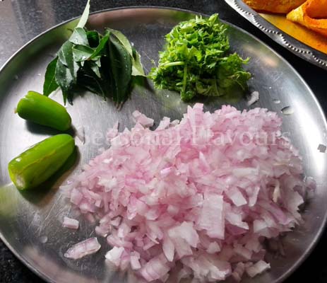 - Finely chop the onions, coriander leaves, slit the chillies lengthwise; wash and pick curry leaves.