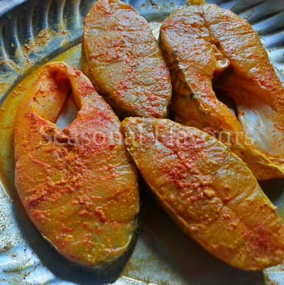 - Clean and wash the fish pieces. Sprinkle salt, turmeric and red chilli powder and coat the fish pieces well. Leave aside for 30 minutes.
