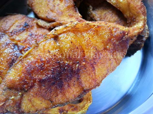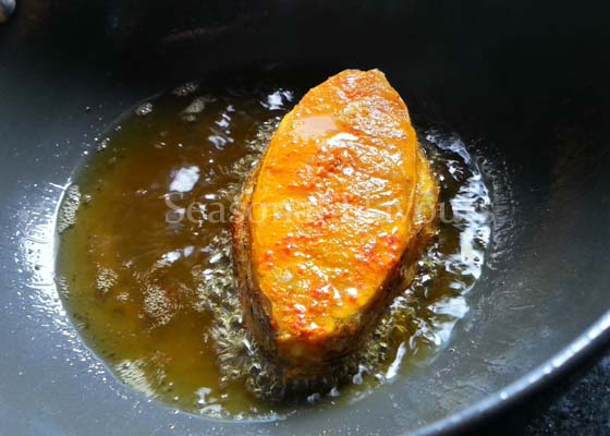 - Heat 2 tbsp oil in a deep-bottomed pan. Slide in the marinated fish slices and fry on medium heat till both sides are well cooked and turn a warm brown.
